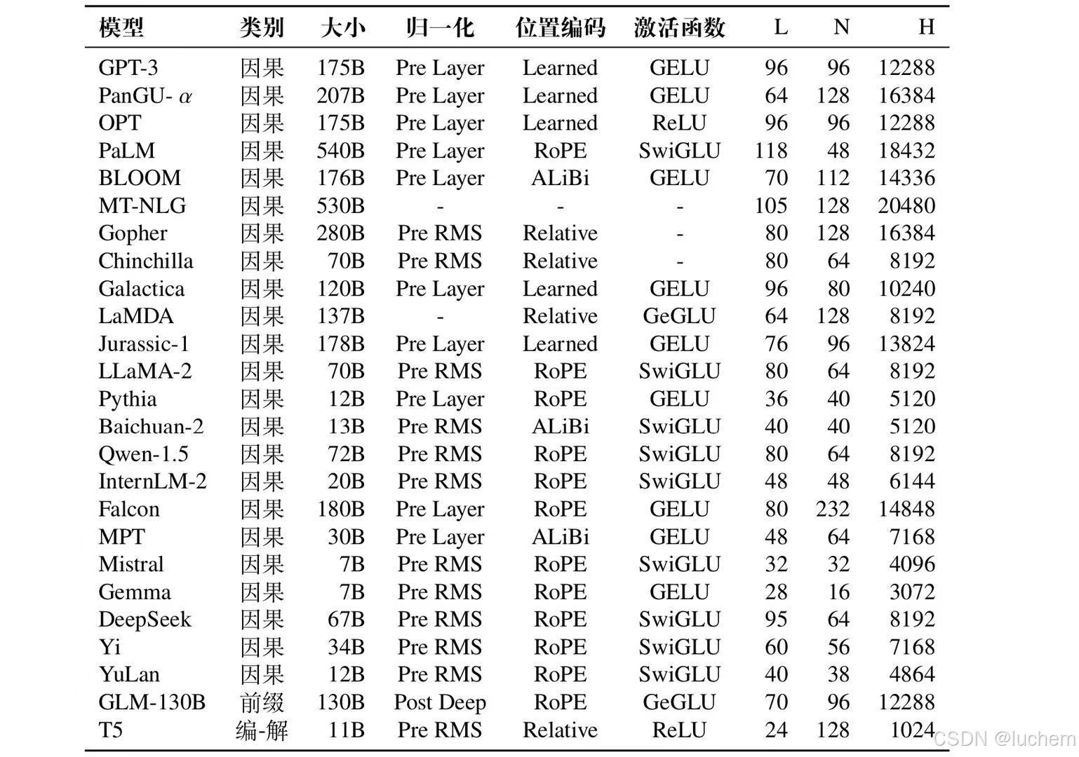 首先,为了增强模型的训练稳定性,建议采用前置的RMSNorm 作为层归一化方法。其次,在选择激活函数时,为了获得更优的模型性能,可以优先考虑使用SwiGLU 或GeGLU。最后,对于位置编码,可以优先选择RoPE 或者ALiBi,这两种位置编码方法在建模长序列数据时通常能够具有较好的性能。