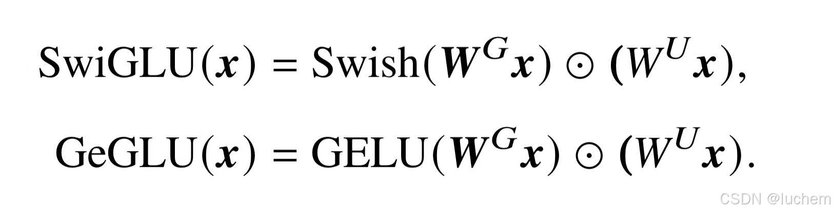 大语言模型(例如PaLM 和LaMDA)也经常采用GLU(Gated LinearUnit)激活函数以及它的变种,特别是SwiGLU 和GeGLU。不同于其他激活函数,GLU 激活函数引入了两个不同的线性层。其中一个线性层的输出将被输入到一个激活函数(例如,GeGLU 采用GELU 激活函数)中,其结果将和另一个线性层的输出进行逐元素相乘作为最终的输出。SwiGLU 和GeGLU 激活函数的计算公式如下所示: