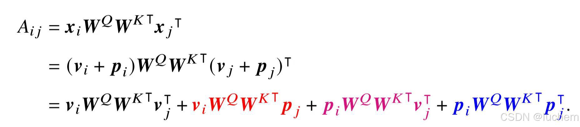 - 相对位置编码:相对位置编码是根据键和查询之间的偏移量计算得来的。计算得到的相对位置编码通常应用于注意力矩阵的计算中,而不是直接与词元本身的位置编码进行相加。其中,Transformer-XL提出了一种相对位置编码方法,在计算键和查询之间的注意力分数时引入了相对位置信息。对于使用绝对位置编码的模型,其注意力值可以进行进一步的分解: