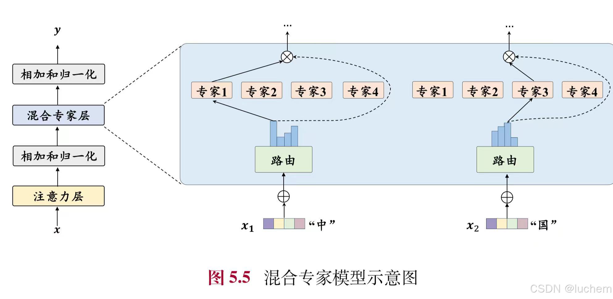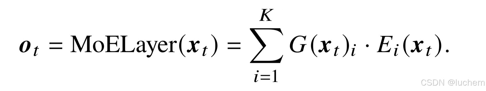 之后,每个被选择的词元的输出的加权和将作为该混合专家网络层的最终输出ot: