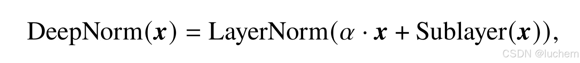 - DeepNorm:DeepNorm 在LayerNorm 的基础上,在残差连接中对之前的激活值x按照一定比例alpha进行放缩。通过这一简单的操作,Transformer 的层数可以被成功地扩展至1,000 层[160],进而有效提升了模型性能与训练稳定性。其计算公式如下: