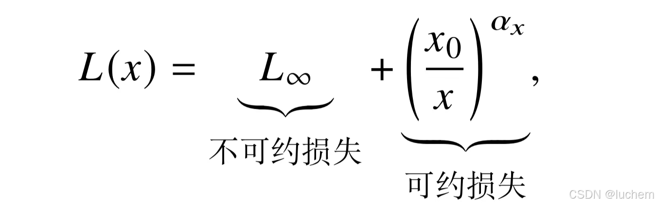 这里𝑥是一个占位符号,可以指代第一个公式中的𝑁、𝐷和𝐶。其中,不可约损失由数据自身特征确定,无法通过扩展法则或者优化算法进行约减;模型性能的优化只能减小可约损失部分。