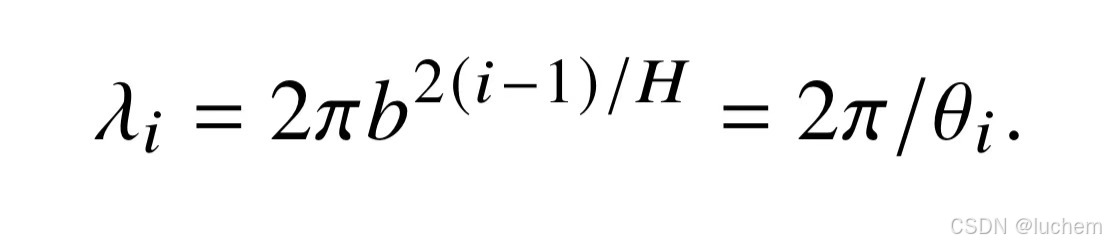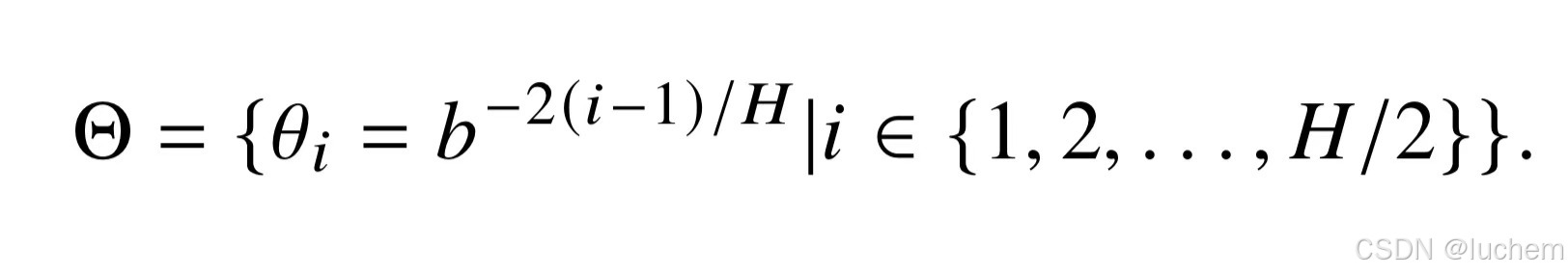 - 根据旋转矩阵的定义,RoPE 在处理查询和键向量的时候,将每对连续出现的两个元素视为一个子空间。因此,对于一个长度为H的向量来说,将会形成H/2 个这样的子空间。在这些子空间中,每一个子空间i ∈{1,...,H/2}所对应的两个元素都会根据一个特定的旋转角度t·sita 进行旋转,其中t代表位置索引,而sita表示该子空间中的基。与正弦位置嵌入类似,RoPE 将基sita 定义为底数b(默认值是10000)的指数: