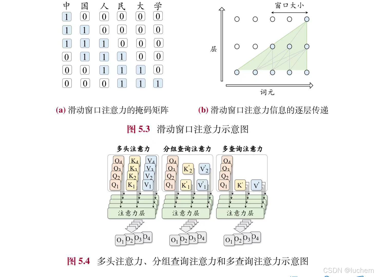 - 稀疏注意力机制:尽管完整自注意力机制具有较强的建模能力,但是它需要平方级的计算复杂性。在处理长序列时较为显著,带来了较大的计算和存储开销。为了降低注意力机制的计算复杂度,研究人员提出了多种高效的注意力变种。其中,滑动窗口注意力机制(Sliding Window Attention, SWA)是大语言模型中使用最多的一种稀疏注意力机制。不同于完整的注意力机制,滑动窗口注意力根据词元位置,仅仅将位置索引上距离该词元一定范围内的词元考虑到注意力的计算中。具体来说,滑动窗口注意力设置了一个大小为w的窗口,对每个词元ut,只对窗口内的词元[ut-w+1,...,ut]进行注意力计算,从而将复杂度降低到O(wT)。