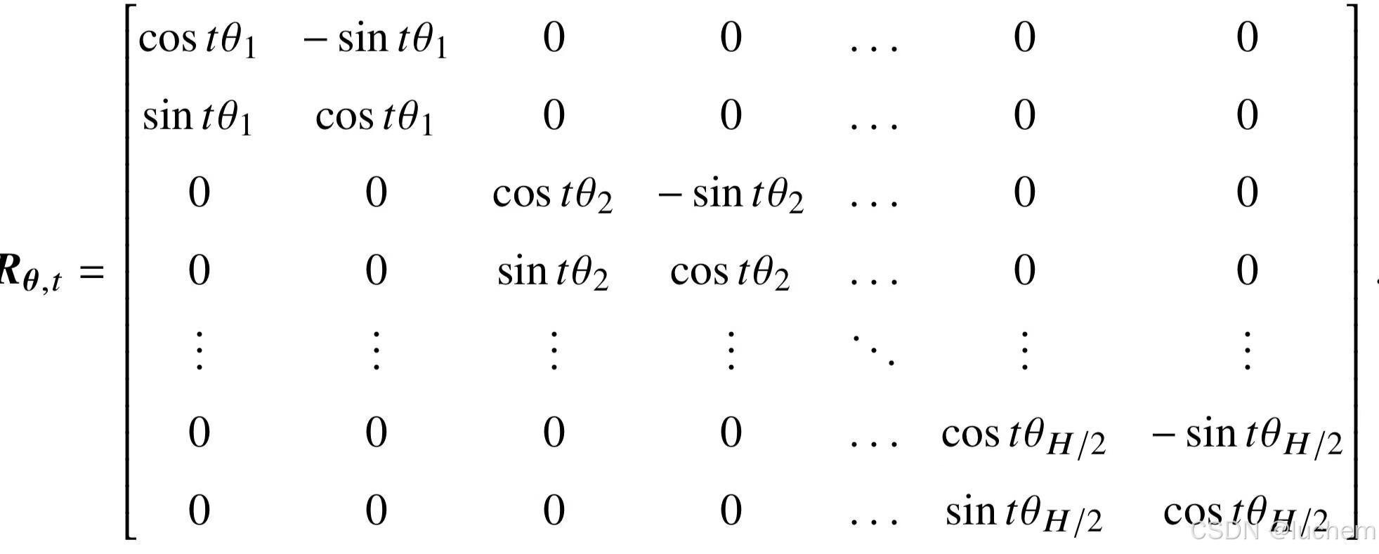 - 旋转位置编码(Rotary Position Embedding ,RoPE):RoPE 巧妙地使用了基于绝对位置信息的旋转矩阵来表示注意力中的相对位置信息。RoPE 根据位置信息为序列中每个词元所对应的设置了独有的旋转矩阵,并和对应的查询和键进行相乘进行融合。形式化,位置索引为t对应的旋转矩阵定义如下所示: