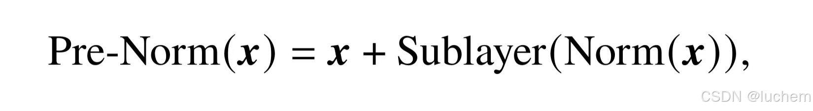 - Pre-Norm:与Post-Norm 不同,Pre-Norm将归一化模块应用在每个子层之前。其计算公式如下: