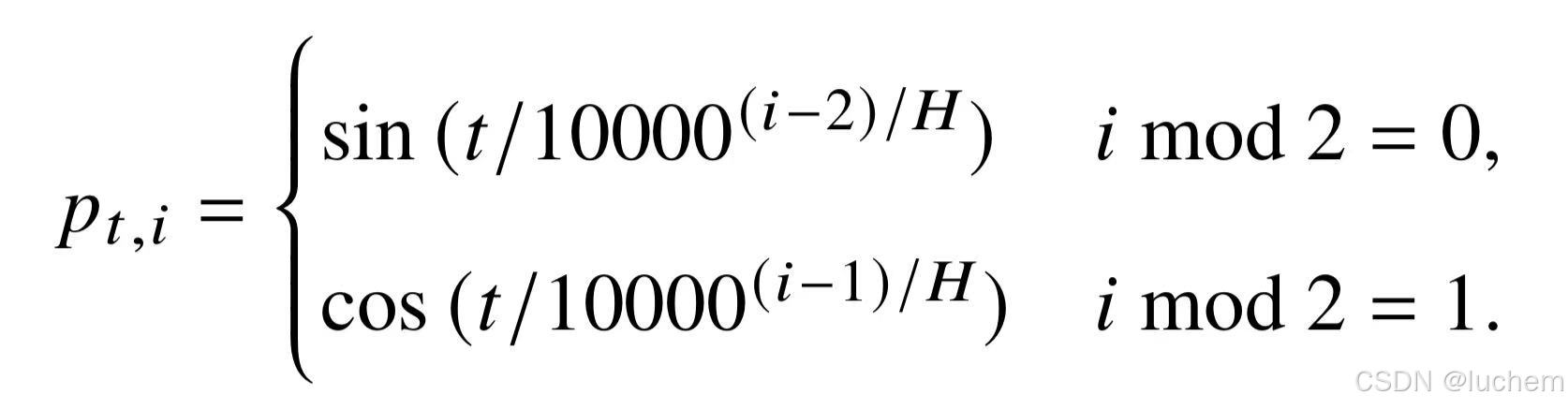 - 其中,pt表示位置t的位置嵌入,vt是该位置词元对应的词向量。原始的Trans-former 采用了正余弦位置编码。该位置编码在不同维度上预先定义了特定的正弦或余弦函数,通过将词元的绝对位置作为输入代入这些函数,从而为这些维度赋予相应的值。对于维度大小为H的位置嵌入,其第i ∈{1,...,H}维的值按照如下方法进行设置: