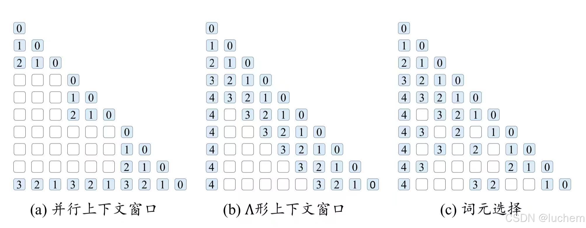 - Λ 形上下文窗口:在处理长文本时,大语言模型有时会表现出一种不均匀关注的现象:它们倾向于对序列起始位置以及邻近的词元赋予更高的注意力权重。基于这一观察,StreamingLLM等工作引入了“Λ 形” 注意力掩码方法,能够有选择性地关注每个查询的邻近词元以及序列起始的词元,同时忽略超出这一范围的其他词元。在给定的有限内存资源下,这种方法能够生成几乎无限长的流畅文本。