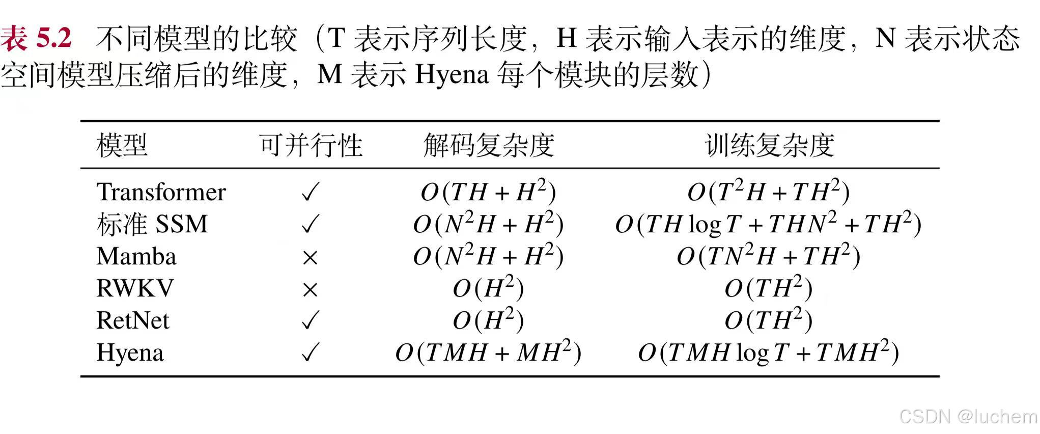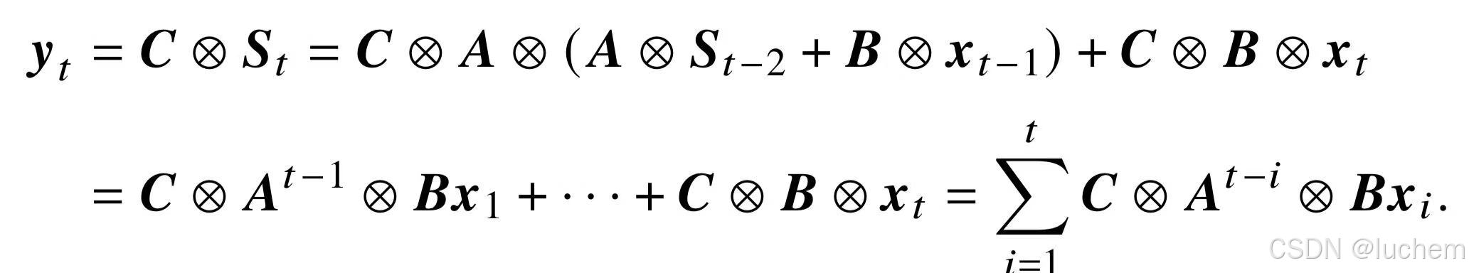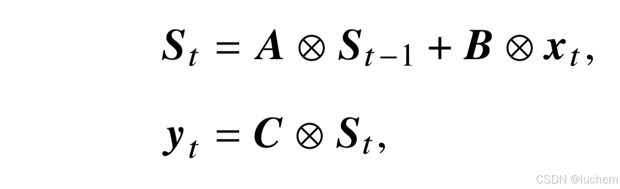 其中,“∗”表示卷积计算。在使用卷积计算时,状态空间模型可以利用快速傅里叶变换加速计算效率,从而通过O(THlog T+THN^2 +TH^2)的复杂度建模整个序列。在循环计算的时候,状态空间模型不需要和Transformer 一样对前面所有时刻的状态进行访问,而是仅仅需要前一个时刻的状态。