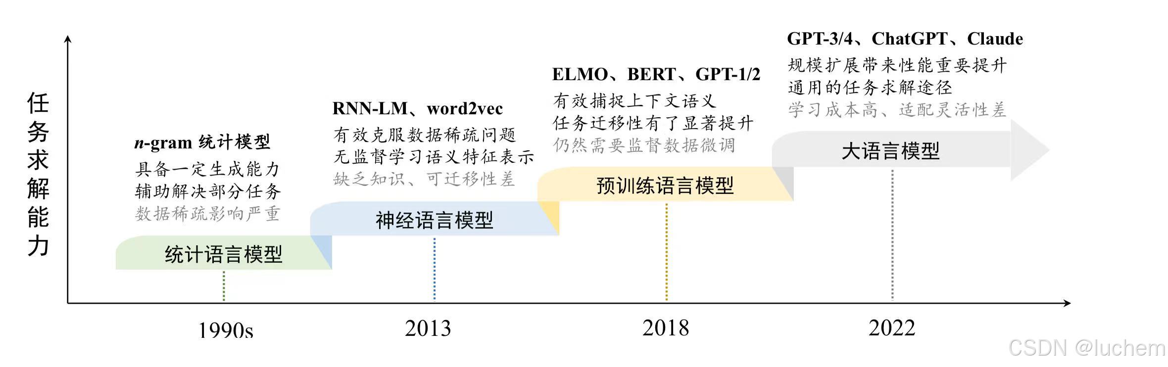 回顾以上历程可以看出,早期的语言模型主要面向自然语言的建模和生成任务,而最新的语言模型(如GPT-4)则侧重于复杂任务的求解