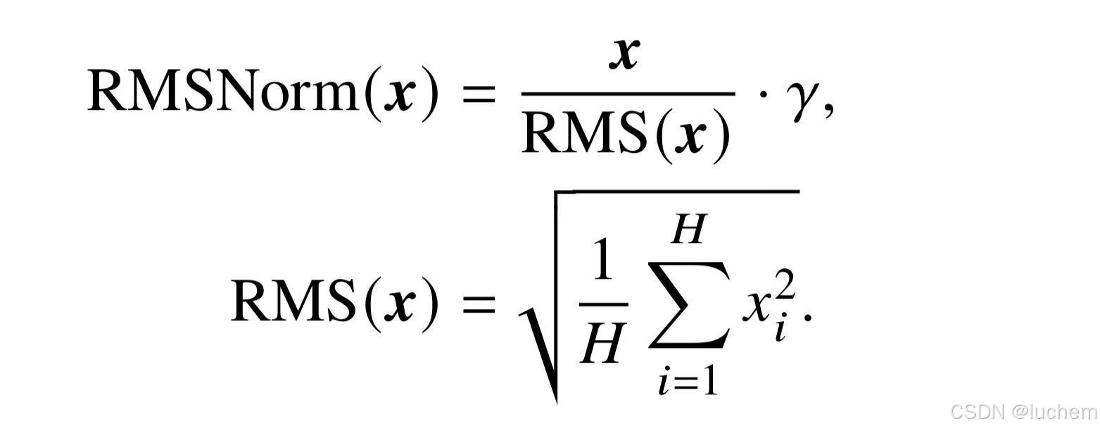 - RMSNorm:为了提高层归一化的训练速度,RMSNorm [159] 仅利用激活值总和的均方根RMS(x)对激活值进行重新缩放。使用RMSNorm 的Transformer 模型相比于之前LayerNorm 训练的模型在训练速度和性能上均具有一定优势。采用RMSNorm 的代表性模型包括Gopher和Chinchilla。其计算公式如下所示: