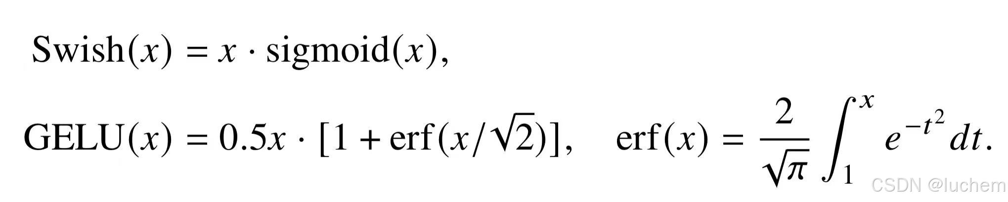 Swish 激活函数将神经元和该神经元的sigmoid 激活的乘积作为新的激活函数。而GELU(Gaussian Error Linear Unit) 则利用标准高斯累积分布函数作为激活函数,被很多的Transformer 模型所采用。相比于原始的ReLU 函数,这些新的激活函数通常能够带来更好的性能并且收敛性更好,但是计算过程更为复杂。Swish 和GELU 的数学表示如下: