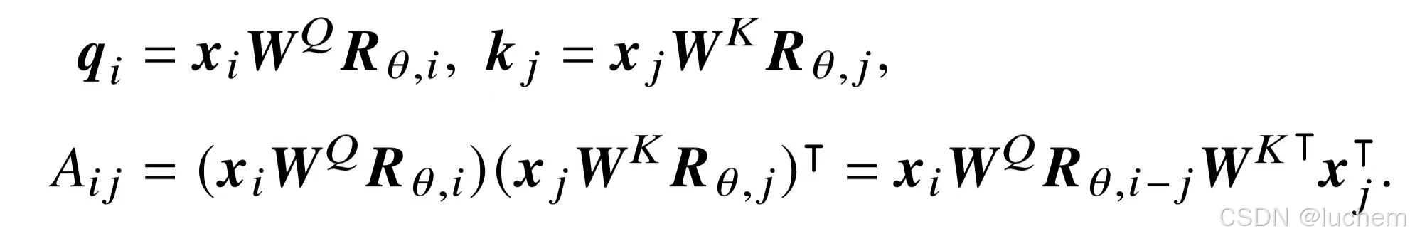 - 利用旋转矩阵中三角函数的特性,位置索引为i的旋转矩阵和位置索引为j的旋转矩阵的转置的乘积等同于位置索引为它们相对距离i−j的旋转矩阵。通过这种方式,键和查询之间的注意力分数能够有效融入相对位置信息。注意力矩阵的公式可以进一步变为如下形式: