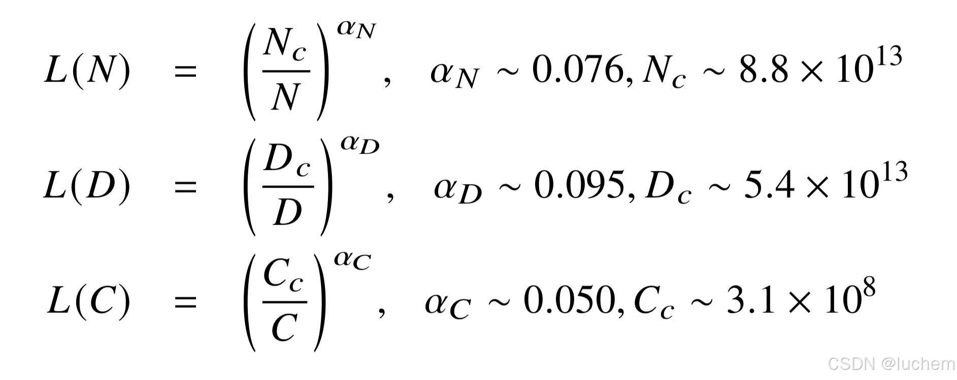 2020 年,Kaplan 等人(OpenAI 团队)首次建立了神经语言模型性能与三个主要因素——模型规模(𝑁)、数据规模(𝐷)和计算算力(𝐶)之间的幂律关系(Power-Law Relationship)。即在给定算力预算𝑐的条件下,可以近似得到以下三个基本指数公式来描述扩展法则:
