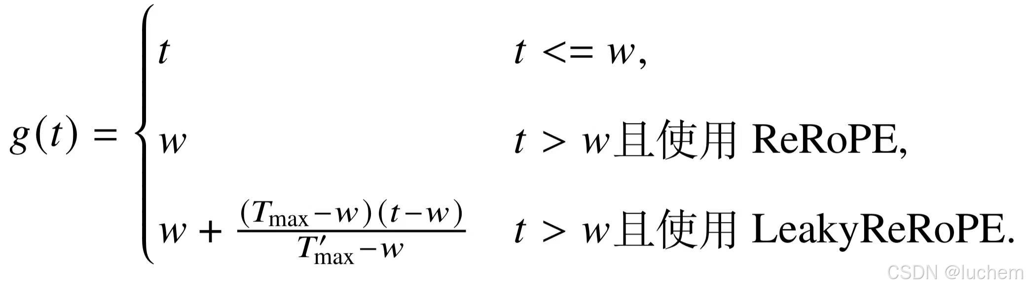 不同于位置内插,位置截断针对不同距离采用了不同的处理方式。该方法依据语言建模的局部性原理,对模型中近距离敏感的位置索引进行保留,同时截断或插值处理远距离的位置索引,确保其不超出预设的最大旋转角度。具体来说,采用位置截断的ReRoPE 和LeakyReRoPE [177] 方法首先设定一个不大于原始上下文窗口长度的窗口大小w (w ≤Tmax)。在此窗口范围内的部分,仍使用原始相对位置索引;对于超出此窗口的部分,位置索引则会被截断至窗口大小,即g(t)= w;或通过线性插值方式,将目标上下文窗口长度的位置索引映射回原始上下文窗口长度.上述位置截断方法可通过以下公式表达: