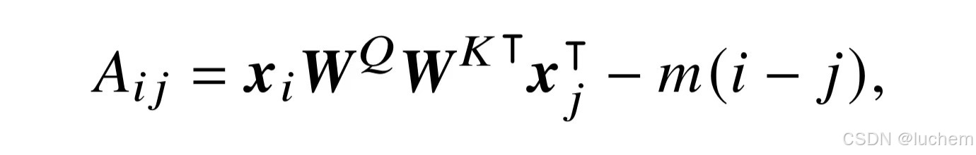 - ALiBi位置编码:ALiBi 是一种特殊的相对位置编码,主要用于增强Transformer 模型的外推能力。具体来说,ALiBi 通过在键和查询之间的距离上施加相对距离相关的惩罚来调整注意力分数。其计算公式如下: