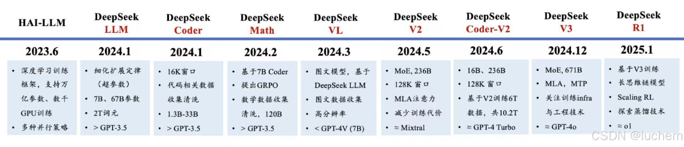 - 语言模型:DeepSeek LLM/V2/V3、Coder/Coder-V2、Math