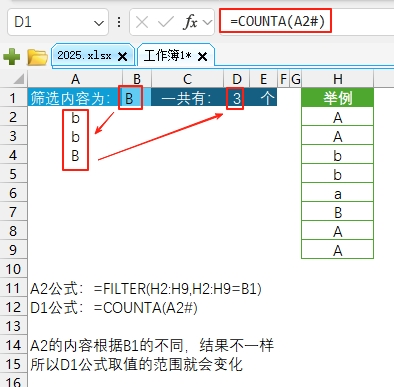 选“B”时,D1公式中"A2#"得到A2:A4的范围