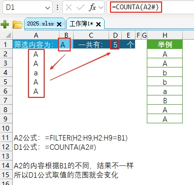 选“A”时,D1公式中"A2#"得到A2:A6的范围