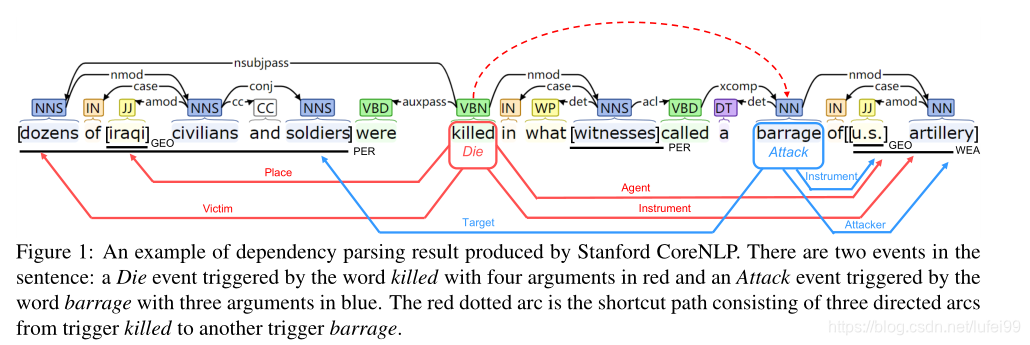 图中有两个事件,一个死亡事件含有四个事件元素(红色)、一个攻击事件含有三个事件元素(蓝色),从killed到barrage根据序列顺序需要六跳,根据dependency tree只需要三跳:
