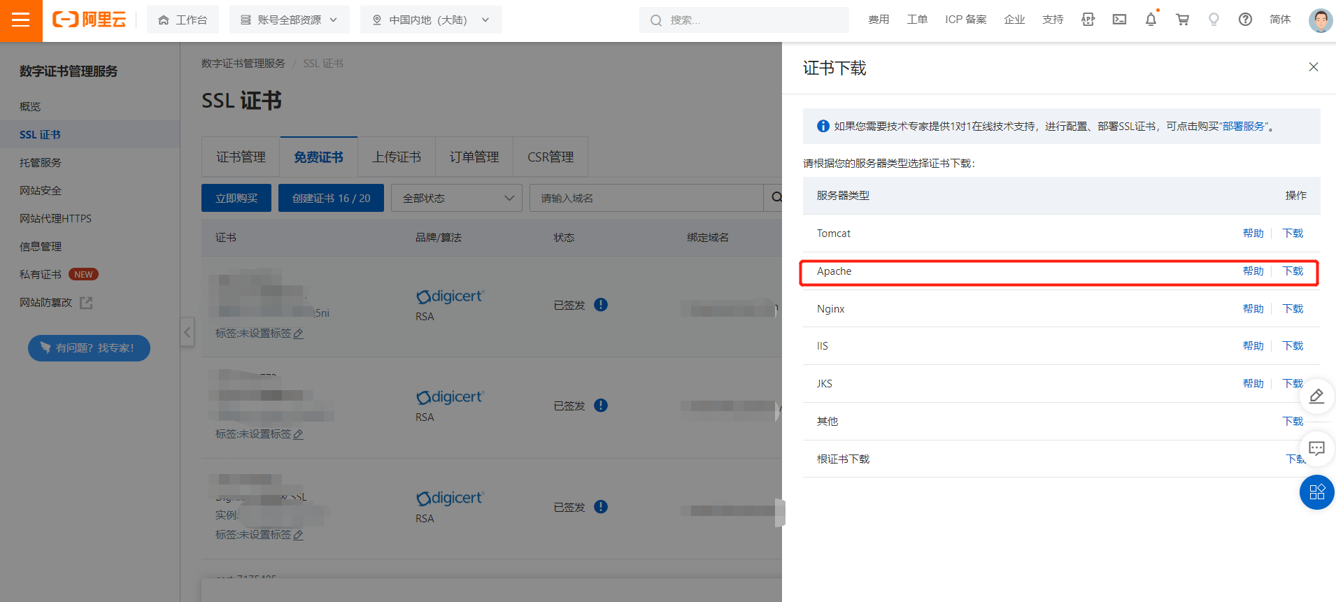 在已签发证书操作栏中,点击下载,根据自己的服务器类型下载对应的证书(因为我的服务器类型是Apache,后续均以此为例进行说明,其他类型的SSL证书部署流程可以参考阿里云官方文档:数字证书管理服务)。