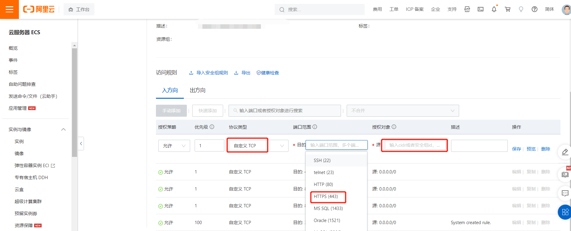 配置规则页面,在“入方向”栏目下,点击“手动添加”,在新的规则中,仅需要对“端口范围”(选择HTTPS(443)),“授权对象”(选择:0.0.0.0/0)两项进行选择提交即可。