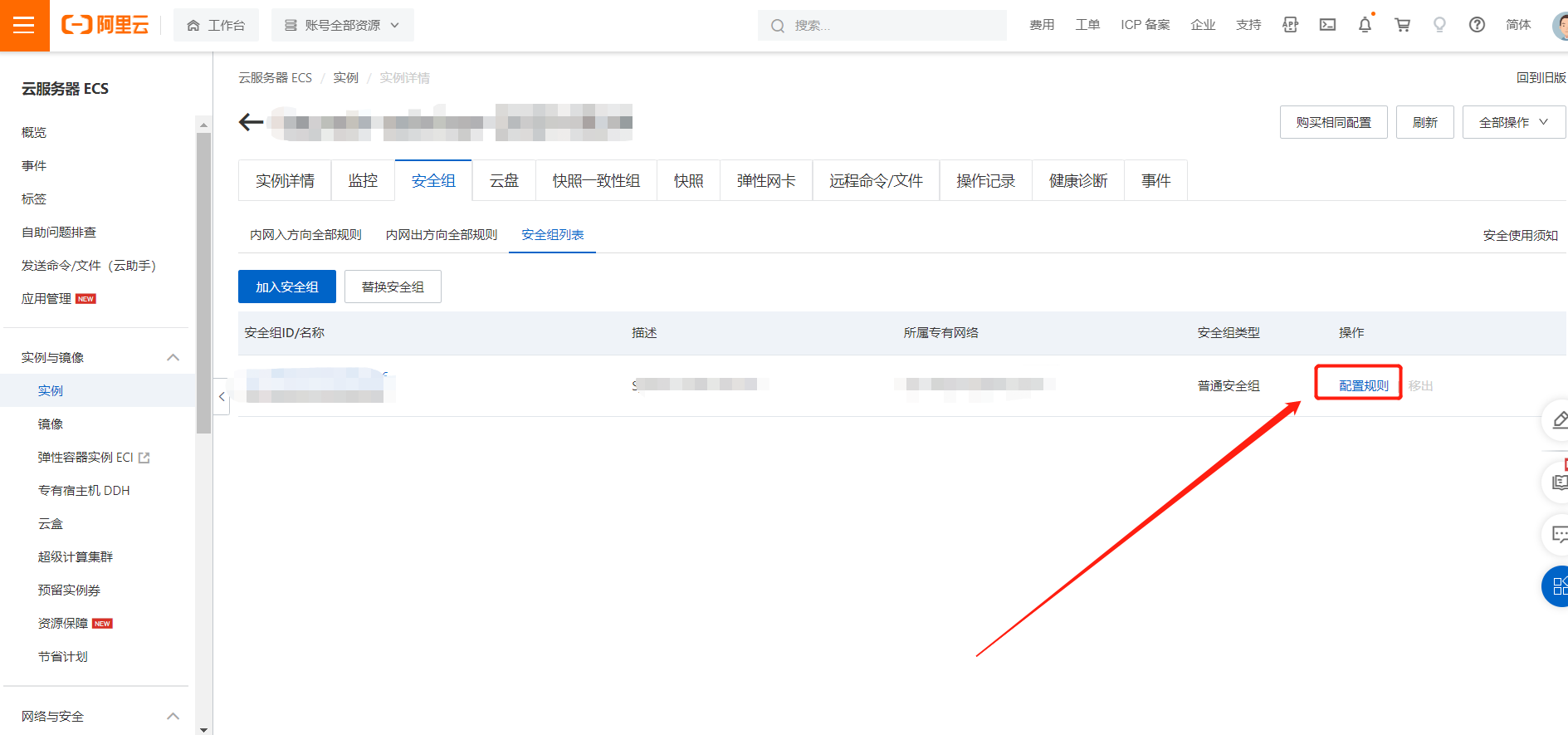 在实例详情页点击“配置安全组规则”,跳转页面中点击“配置规则”