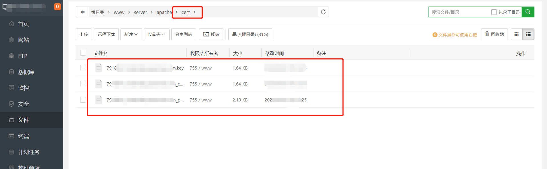 在Apache安装目录中新建cert目录,并将之前下载的证书文件解压,把解压得到的Apache证书、证书链文件和密钥文件上传到cert目录中。(如果有多个域名需要进行SSL证书部署,则需要对应的在Apache安装目录下创建多个cert目录,可以命名为cert1、cert2·····)