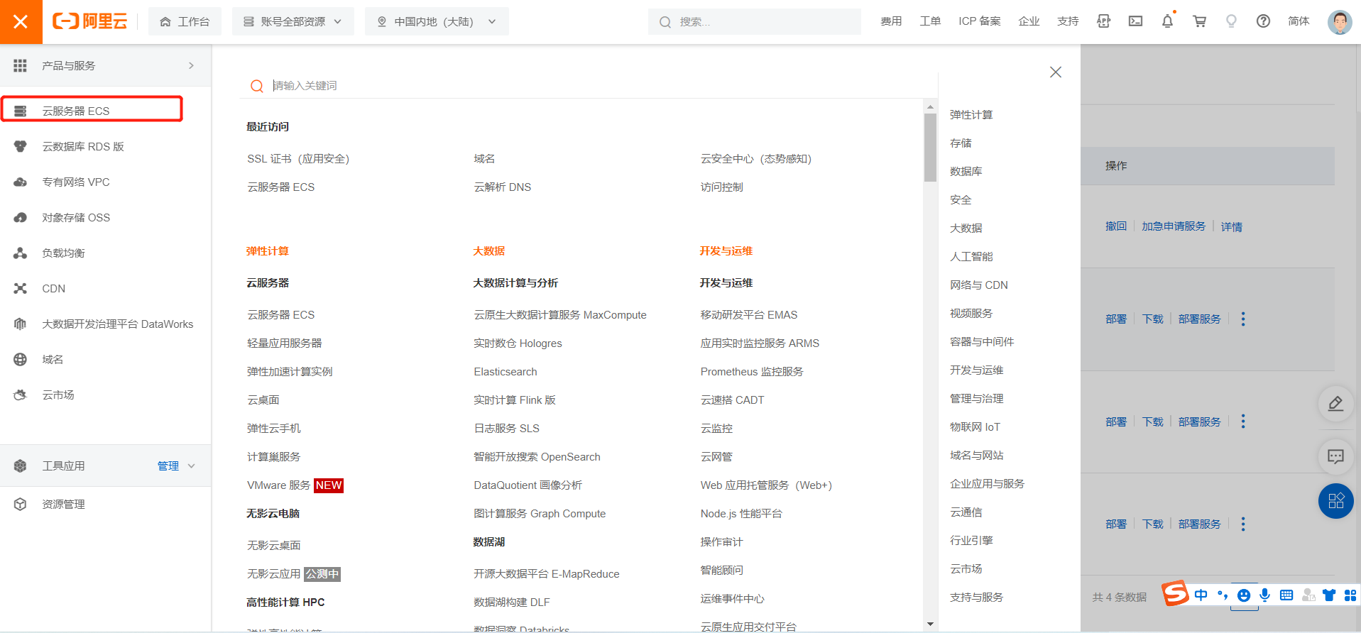 在左上角功能栏找到“云服务器ECS”