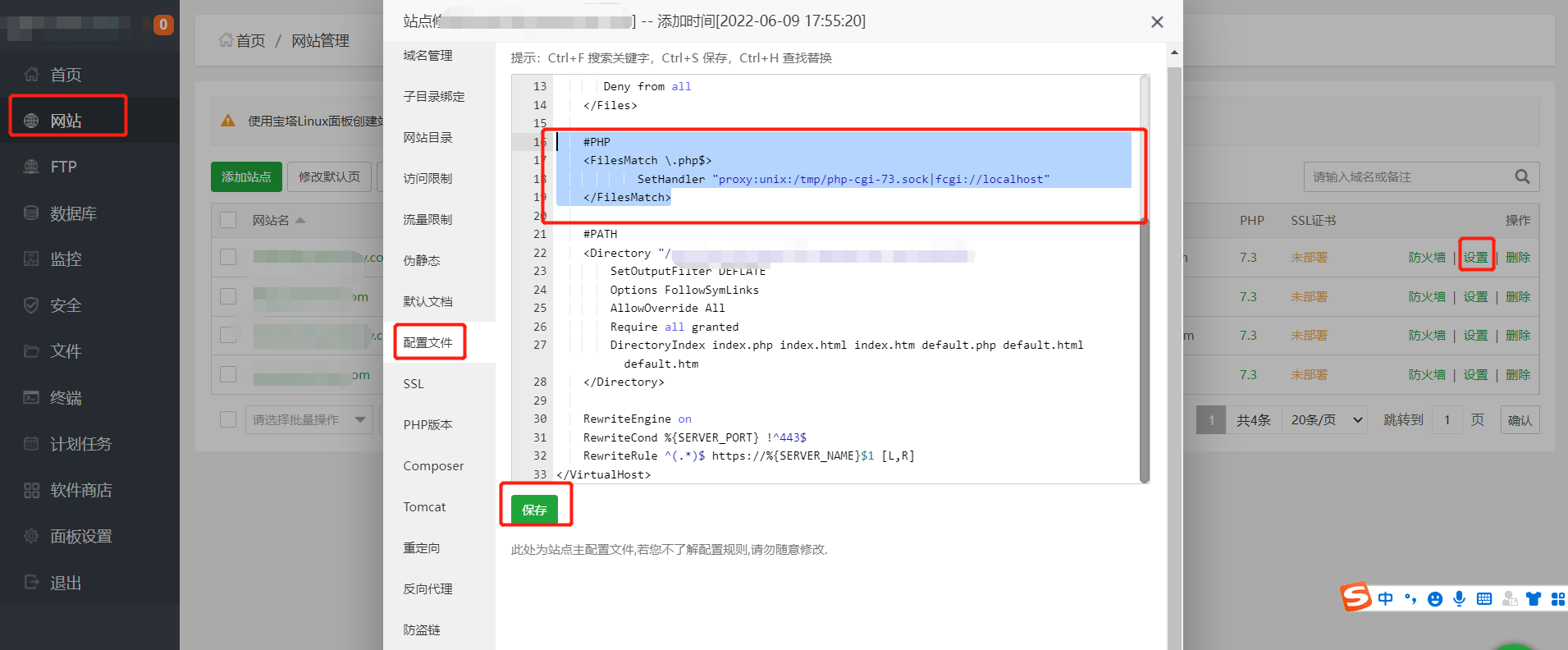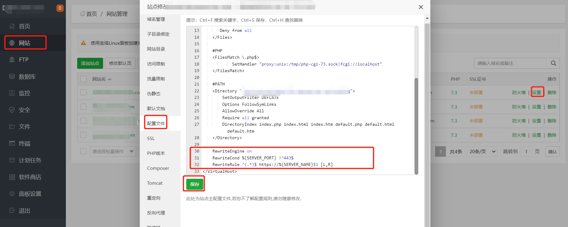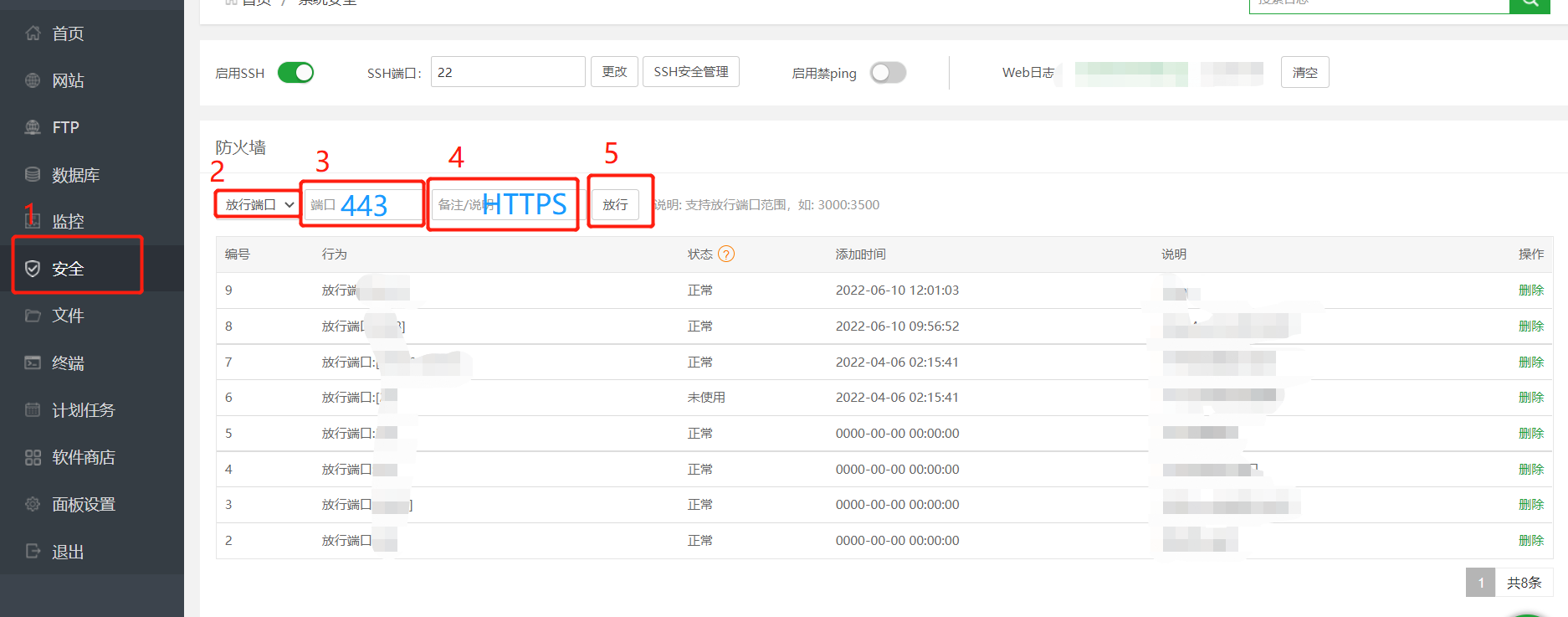如果有宝塔面板,此时还需要在宝塔面板中对443端口进行放行。至此,即完成了服务器上443端口的开启。