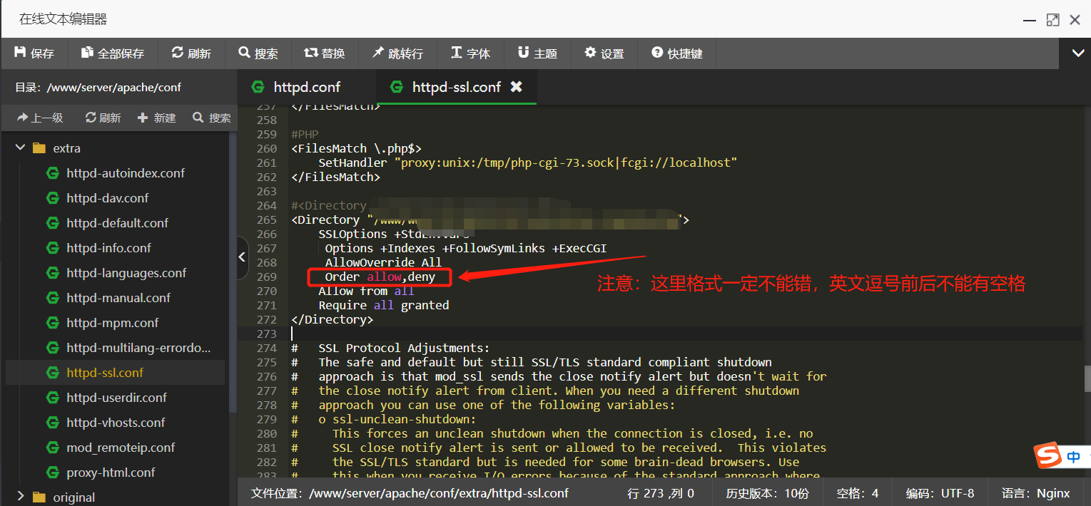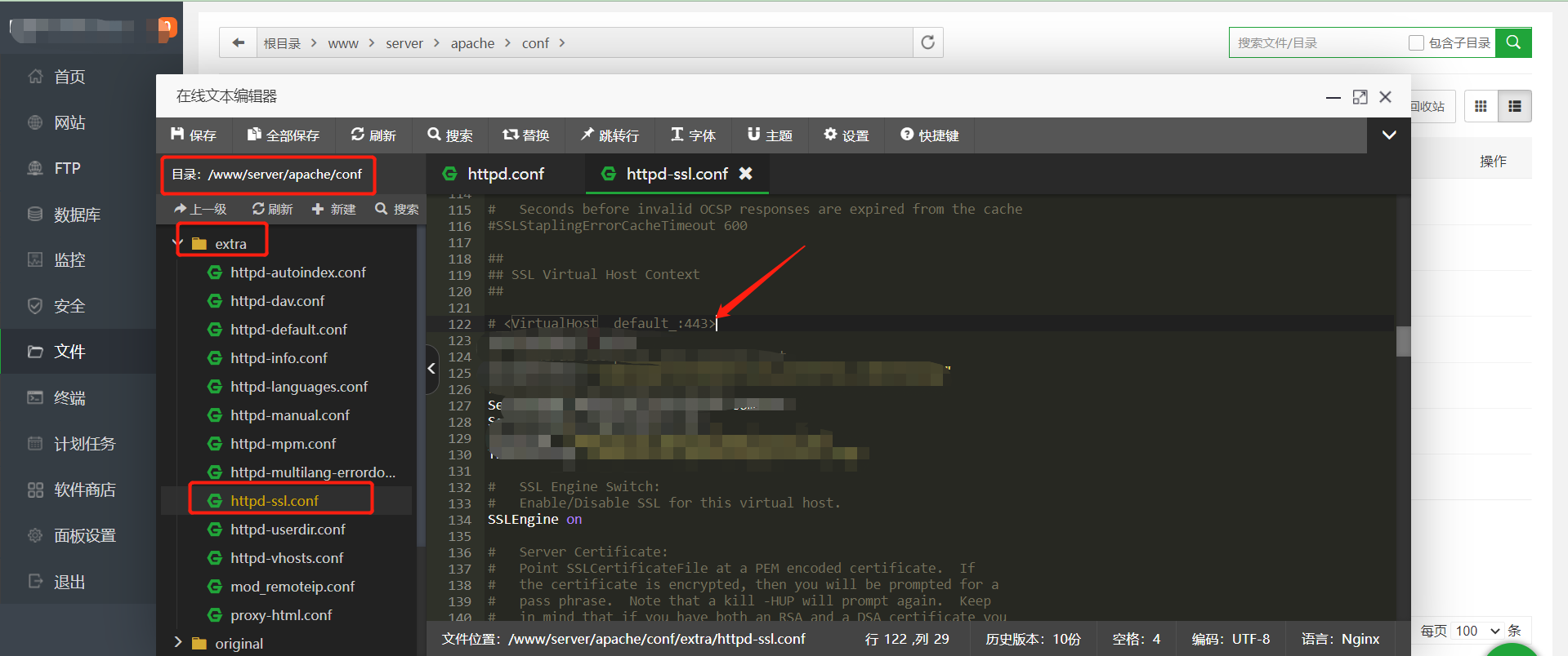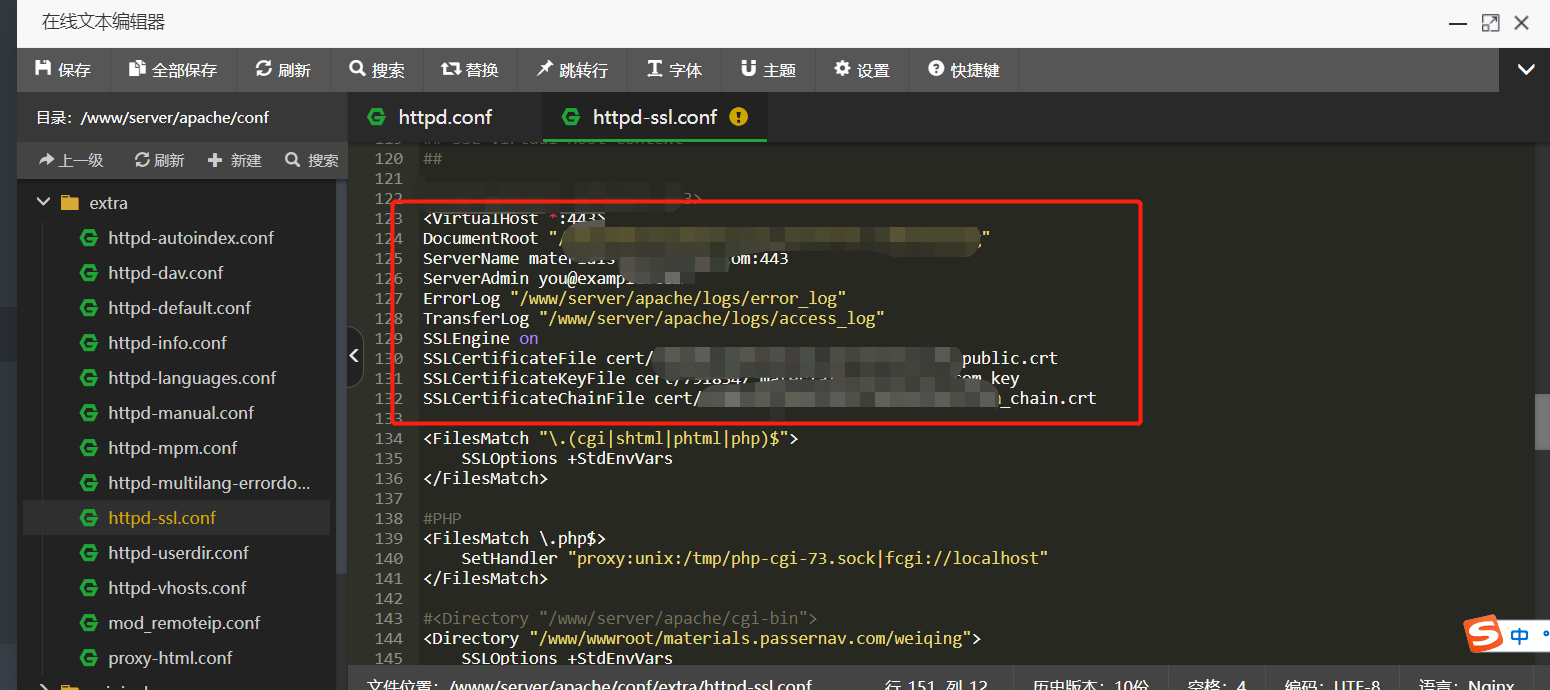 在Apache/conf/extra/目录下,找到并双击打开httpd-ssl.conf文件,按照以下格式进行配置。