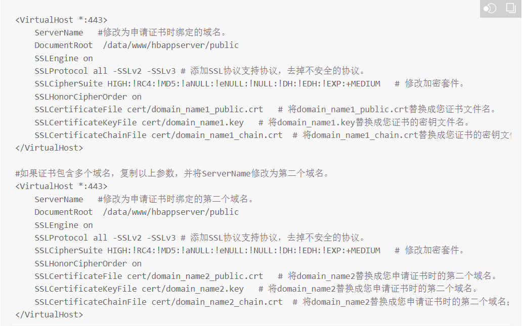 找到SSLCertificateFile对应的代码行,如果前面有#,需将#去掉,然后将上面示例中domain_name1_public.crt替换成您证书文件名,这里文件名中有public,那么替换的文件名也一定是解压出来的那个带有public的文件名(注意文件后缀.crt不能省略)。