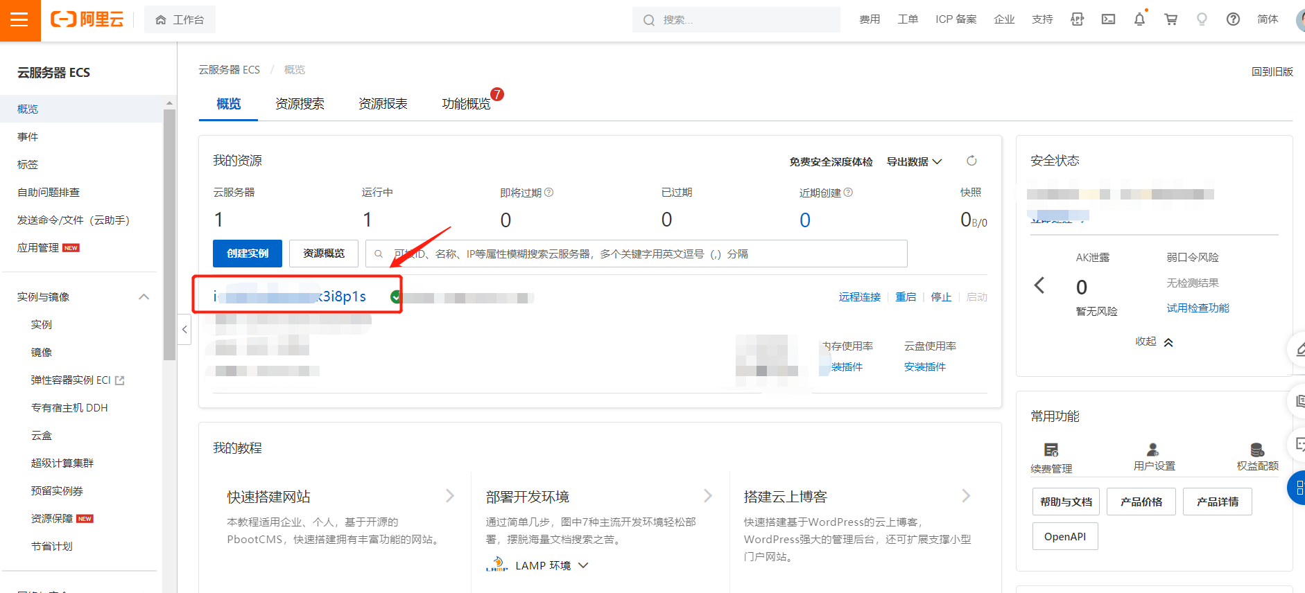在云服务器ECS中找到需要对齐进行操作的那一台服务器,点击该服务器实例进入实例详情页