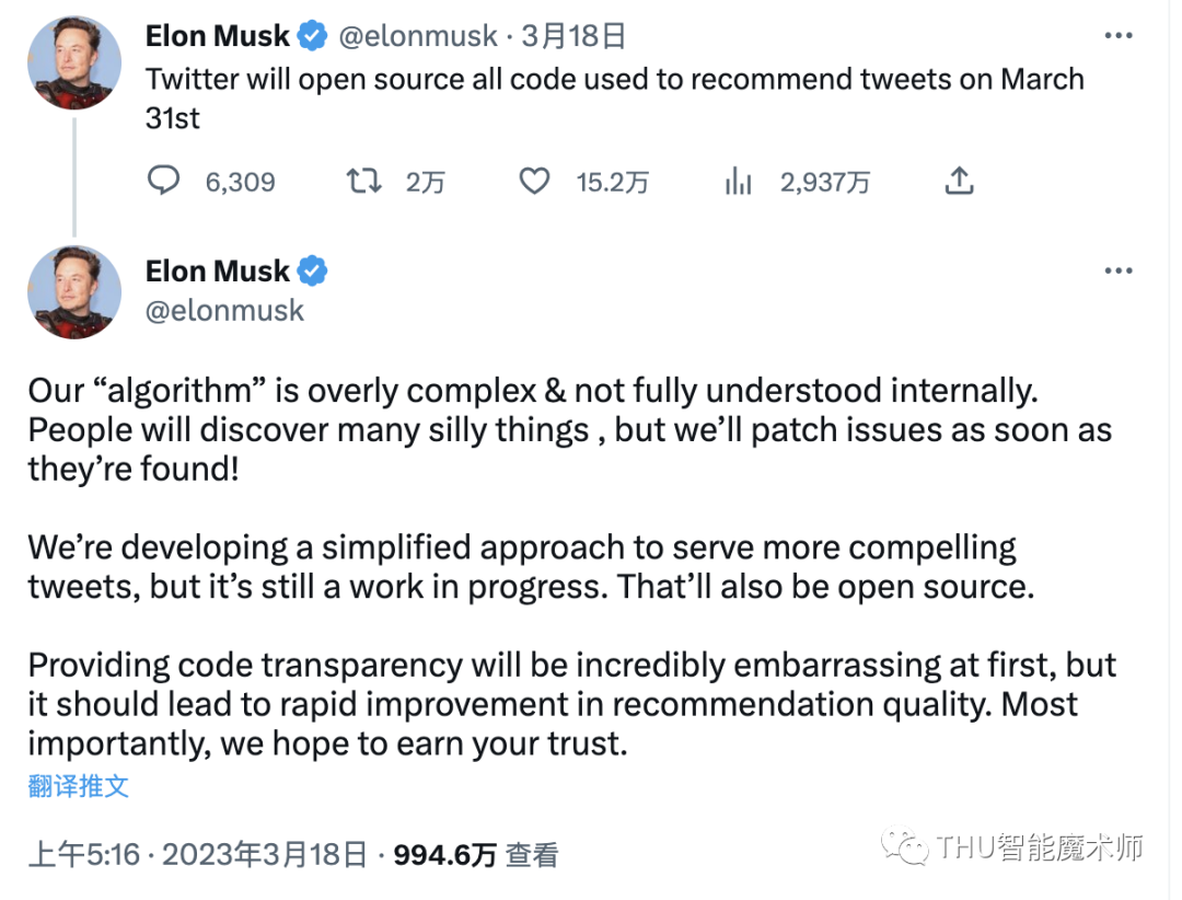 2022年10月接管Twitter后,马斯克关于开源Twitter算法的想法并没有发生改变。2023年2月21日,马斯克称将于下周对Twitter算法进行开源。虽然并未兑现“下周开源”的承诺,但直到3月18日,马斯克再次发声:“Twitter将于3月31日开源所有用于推文推荐的代码。”