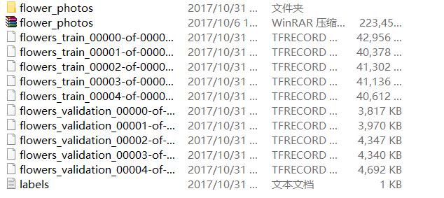 下载完成之后,代码会随机的抽取350张图片组成验证集,剩下的3320张组成训练集,并分别打成5个TFRecord文件。再回到floewers_5文件夹中,我们就可以看到下面这些东西,一个压缩文件,一个解压缩之后的文件夹,10个TFRecord文件和一个labels文件。