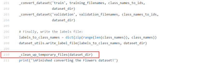 TensorFlow-models内提供了一个download_and_convert_data.py文件,我们可以利用这个代码完成数据准备工作,但是在此之前,建议把download_and_convert_flowers.py文件中的210行代码注释掉,这样一来解压缩之后的原始数据就可以留下来了,这样方便我们查看。