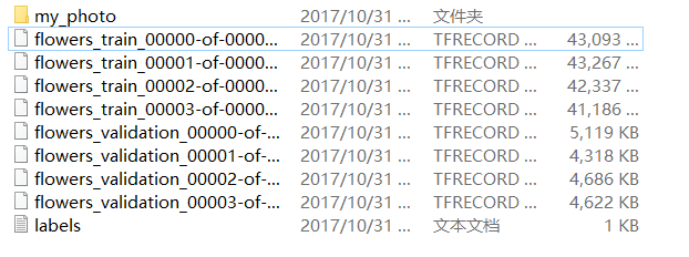 再回到floewers_4文件夹中,我们就可以看到下面这些东西,我们放进去的my_photo文件,8个TFRecord文件和一个labels文件。