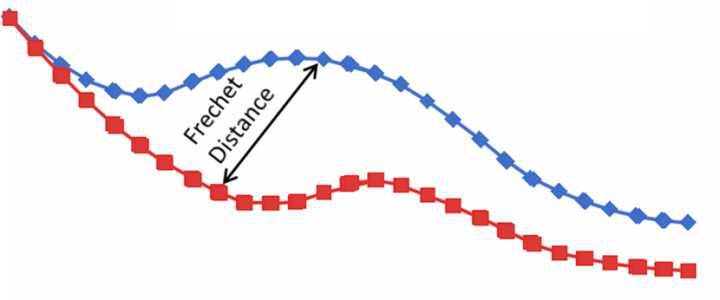 其中FID(Fréchet distance(弗雷歇距离) )是法国数学家Maurice René Fréchet在1906年提出的一种路径空间相似形描述,直观来说是狗绳距离:主人走路径A,狗走路径B,各自走完这两条路径过程中所需要的最短狗绳长度,如下图所示,所以说,FID与生成图像的质量呈负相关。