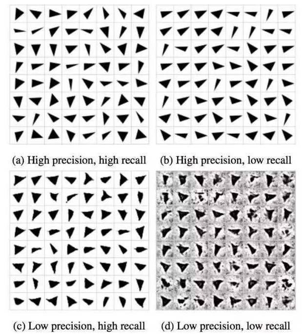 最后,研究者们也在精度(precision、)、召回率(recall)以及两者的平均数F1上做了测试,测试细节请看论文,也并没有发现其他GAN比原始GAN更突出的地方。