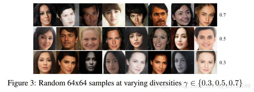 BEGAN的训练结果:不同的γ可以在图片的质量和生成多样性之间做选择。