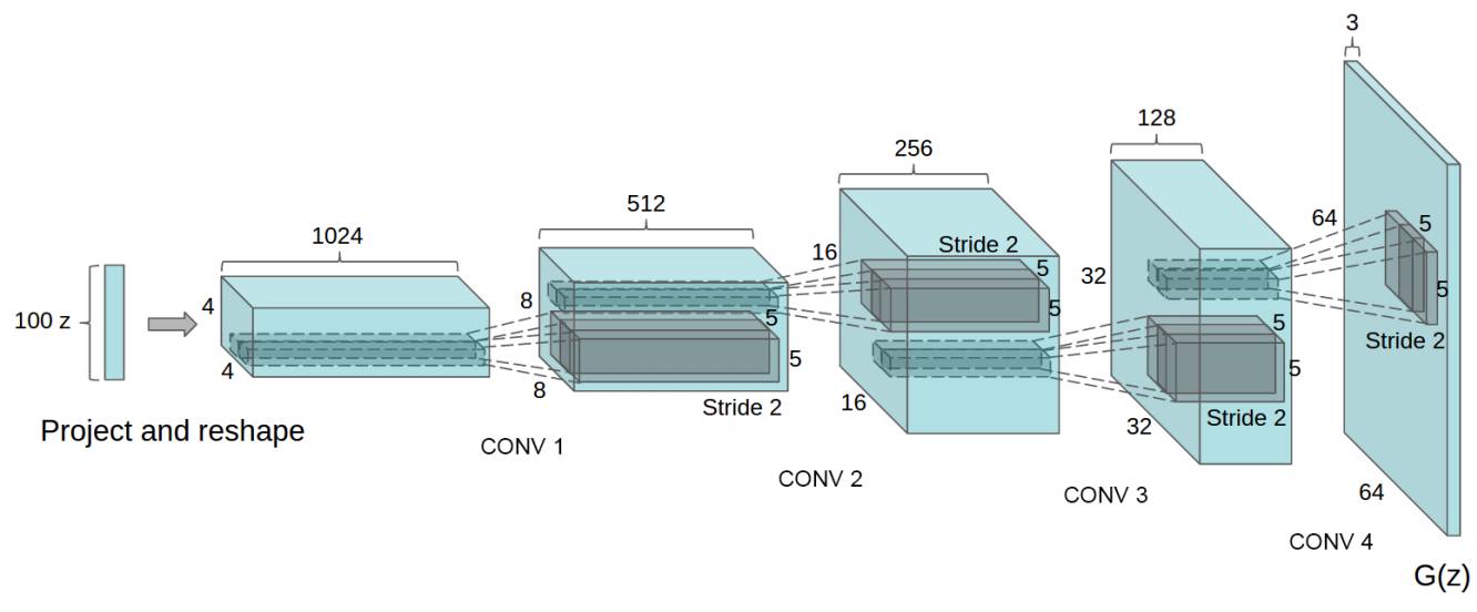 DCGAN的生成器网络结构如上图所示,相较原始的GAN,DCGAN几乎完全使用了卷积层代替全链接层,判别器几乎是和生成器对称的,从上图中我们可以看到,整个网络没有pooling层和上采样层的存在,实际上是使用了带步长(fractional-strided)的卷积代替了上采样,以增加训练的稳定性。