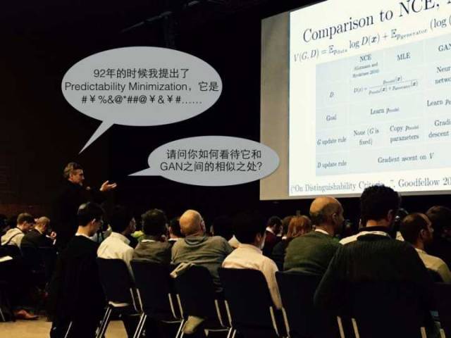 外人看上去只是普通的一次提问或者辩证,但是goodfellow反应及其激烈,甚至都要发火了。原来早在GAN提出之后,他们两人就已经互相往来邮件讨论过这个问题,大概流程就是Jürgen Schmidhuber认为GAN是他的PM模型的演化,现在GAN那么出名了,goodfellow应该承认PM对GAN的贡献。Goodfellow当然说不,自己的成果平白无故被上了一个套,要谁谁也不干,而且在本质上GAN和PM也有很大的不同。但是Jürgen Schmidhuber还是不死心,以至于事情闹到了NIPS大会上,结果就是: