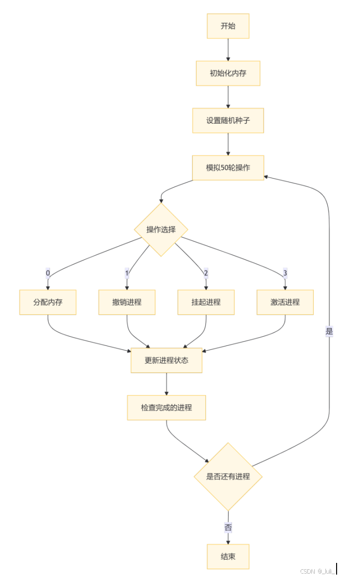 操作选择:随机选择一个操作(0-3),分别对应分配内存、撤销进程、挂起进程和激活进程。分配内存:根据随机生成的大小和持续时间创建新的内存分配。