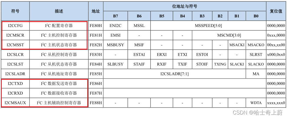 主机总线速度设置 : ,其中Sysclk为CPU工作频率,MSSPEED为I2CCFG寄存器的B5:B0位段。例如Sysclk=12MHz,MSSPEED=28,那么I2C总线速度Speed=100KHz。