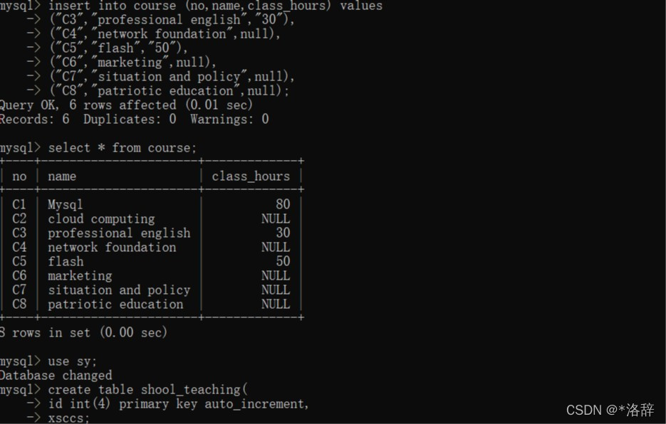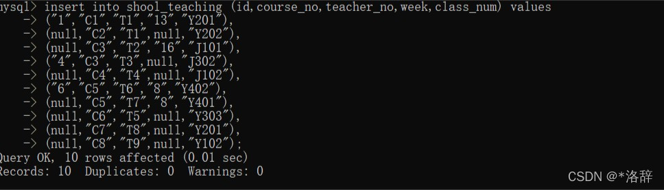 本文介绍了如何在教师表、课程表和授课表中进行数据插入,包括指定字段和所有字段的插入操作。教师表包含了教师号、姓名、职称和工资等信息,课程表记录了课程号、课程名和课时数,授课表则详细列出了授课教师、课程、周数和教室。此外,还展示了如何查询这些表格的关键字段数据。