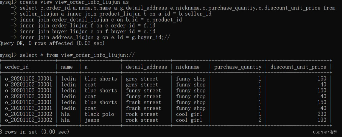 - 创建订单信息视图“view_order_ info_姓名全拼”查看上述内容