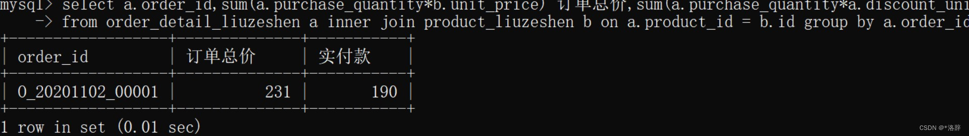 - 根据订单号分组查看订单总价(sum(采购数量*产品单价))、实付款(sum(采购数量*折扣单价))