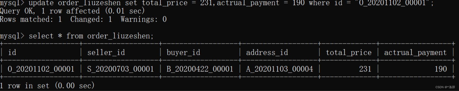 - 根据上述代码计算出的值修改订单表中O_20201102_00002订单的实付款数据