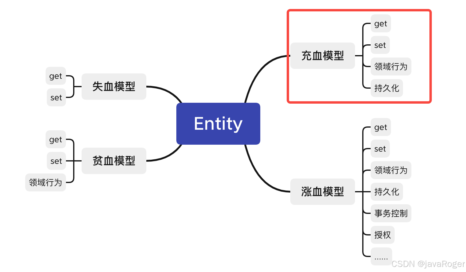 - 涨血模型:把和业务逻辑不相关的其他应用逻辑(如授权、事务等)都放到领域模型中,service都不需要,所有的业务逻辑、数据存储都放在一个类中。