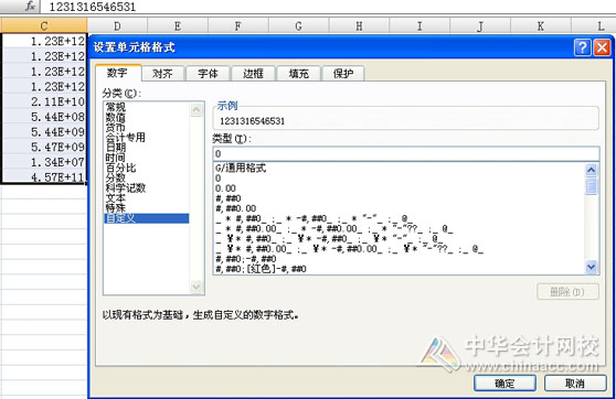二、还有一个更快的,设置单元格属性类型为0。比如已在单元A1:A100输入了号码,按以下步骤做:选择单元A1:A100,单击鼠标右键,选择设置单元格式,选择自定义,在‘类型’中输入‘0’即可,注意这种方式同样会丢失以0开头的数字串。如下图: